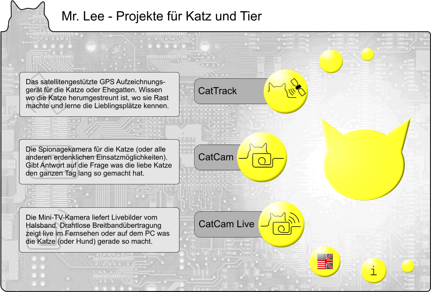 Vorlesehilfe für Sehbehinderte: Mister Lee - Projekte für Katz und Tier CatCam - Die Spionagekamera für die Katze (oder alle anderen erdenklichen Einsatzmöglichkeiten). Gibt Antwort auf die Frage was die liebe Katze den ganzen Tag lang so gemacht hat. CatCam Live - Die Mini-TV-Kamera liefert Livebilder vom Halsband. Drahtlose Breitbandübertragung zeigt live im Fernsehen oder auf dem PC was die Katze (oder Hund) gerade so macht. CatTrack - Das satellitengestützte GPS Aufzeichnungsgerät für die Katze oder Ehegatten. Wissen wo die Katze herumgestreunt ist, wo sie Rast machte und lerne die Lieblingsplätze kennen. |