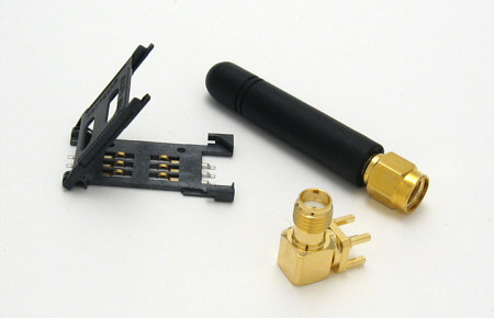 In order to come to quick results the GSM component set supplies you with basic components. The set includes a GSM antenna, an antenna connector and a SIM card holder. You can choose between different variants (see below and state as comment in the order form).