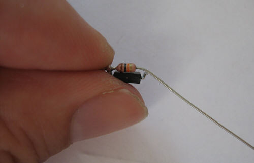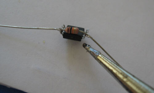 Step 2 - The chip is flipped upside down and the 10k resistor is placed across the surface. Then it is soldered to one pin. The marking for pin 1 is below the lower left corner of the chip (faces to the working surface)